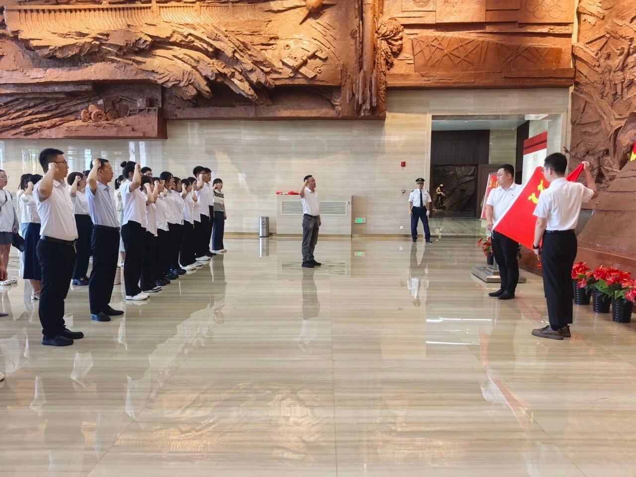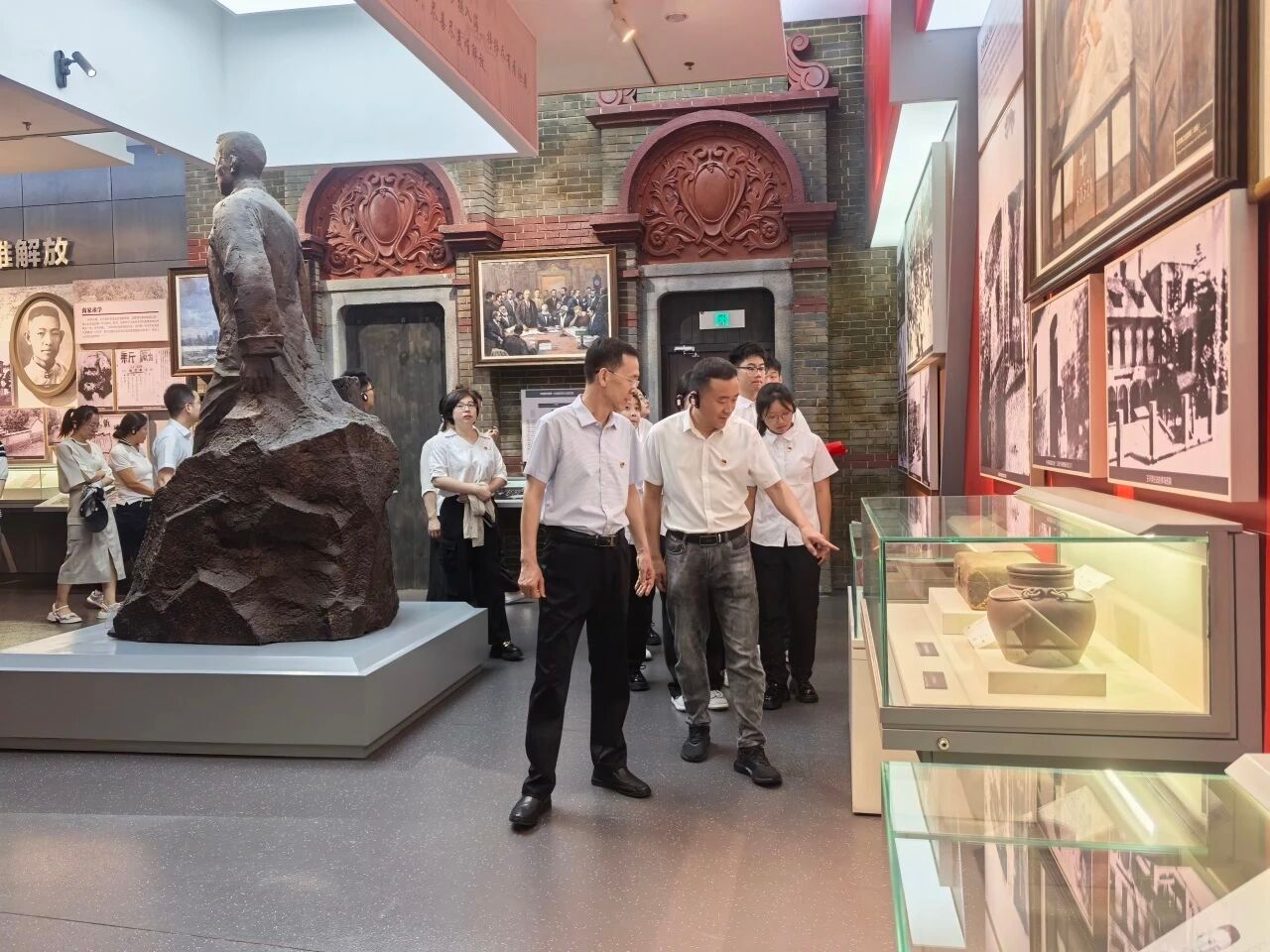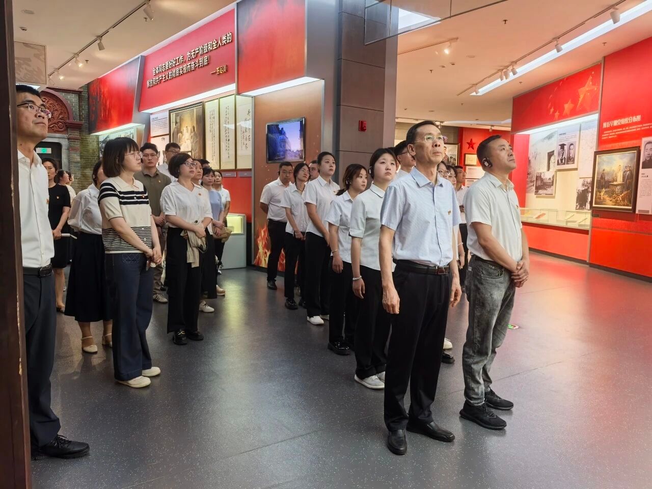 在展馆大厅,全体党员庄严列队,面向鲜红的党旗,重温入党誓词,铿锵有力的誓言,表达了全体党员对党的无限忠诚和坚定信念,激励大家牢记初心使命,永葆政治本色。在工作人员的带领下,全体党员依次参观了五大主题展区。馆内一段段详实的文字记录、一幅幅珍贵的历史图片、一件件厚重的实物展品,生动再现了中国共产党筚路蓝缕、砥砺奋进的辉煌历程。大家认真聆听讲解,不时驻足交流,深切感悟党的伟大精神和革命先辈的崇高品格,进一步加深了对党的历史的理解和认同。