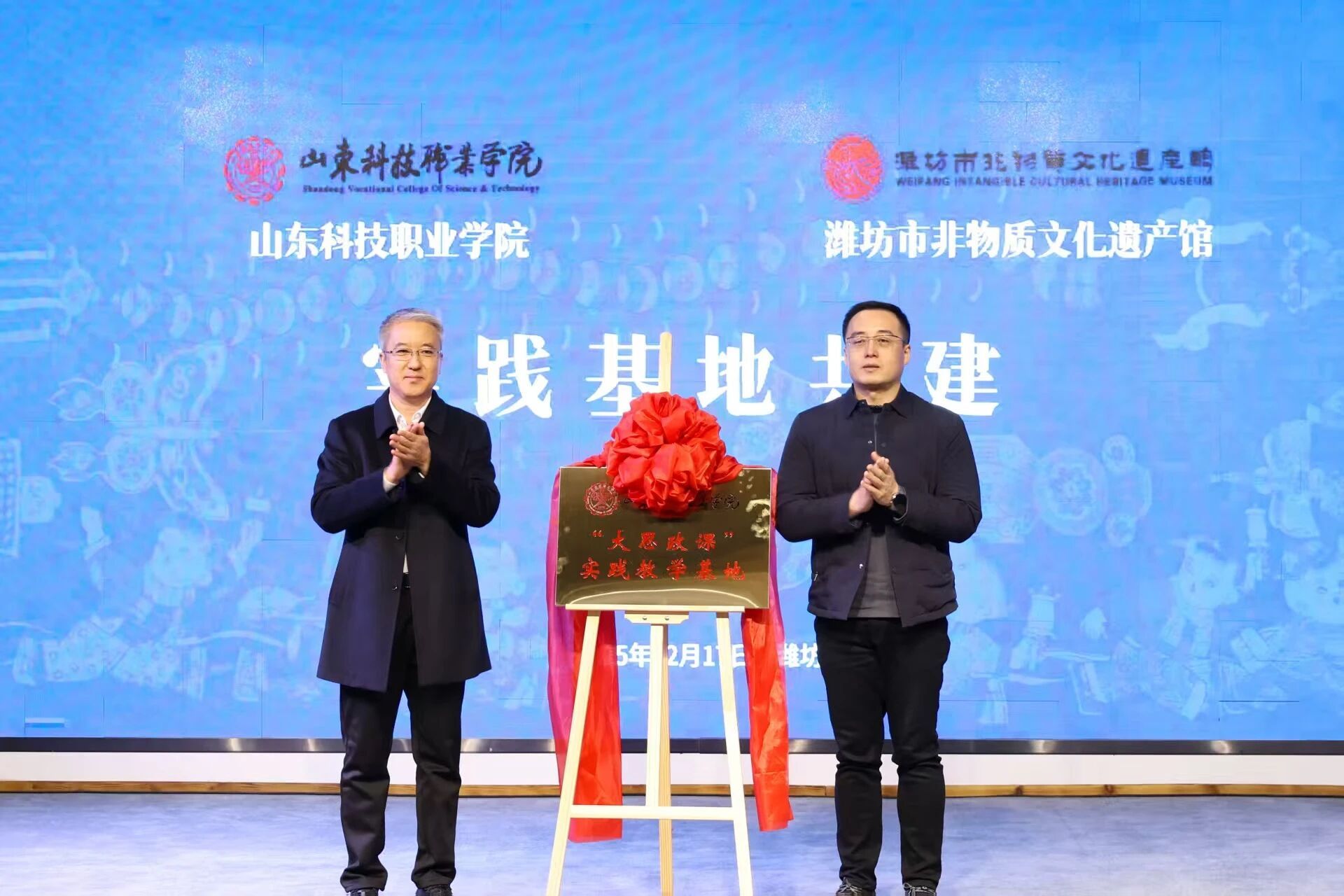 12月17日,山东科技职业学院与潍坊市非物质文化遗产馆共建“大学生社会实践基地”和“非遗传承教育基地”,揭牌仪式在潍坊市非物质文化遗产馆举行。学校党委副书记秦建坤,潍坊市文化和旅游局党组成员、四级调研员李义龙,齐鲁文化(潍坊)生态保护区服务中心副主任、潍坊市非物质文化遗产馆馆长徐明政,潍坊市非物质文化遗产馆代表,经济管理系党总支、思政课教学部、审计处直属党支部、图书馆直属党支部全体党员及学生入党积极分子代表70余人参加了本次活动。