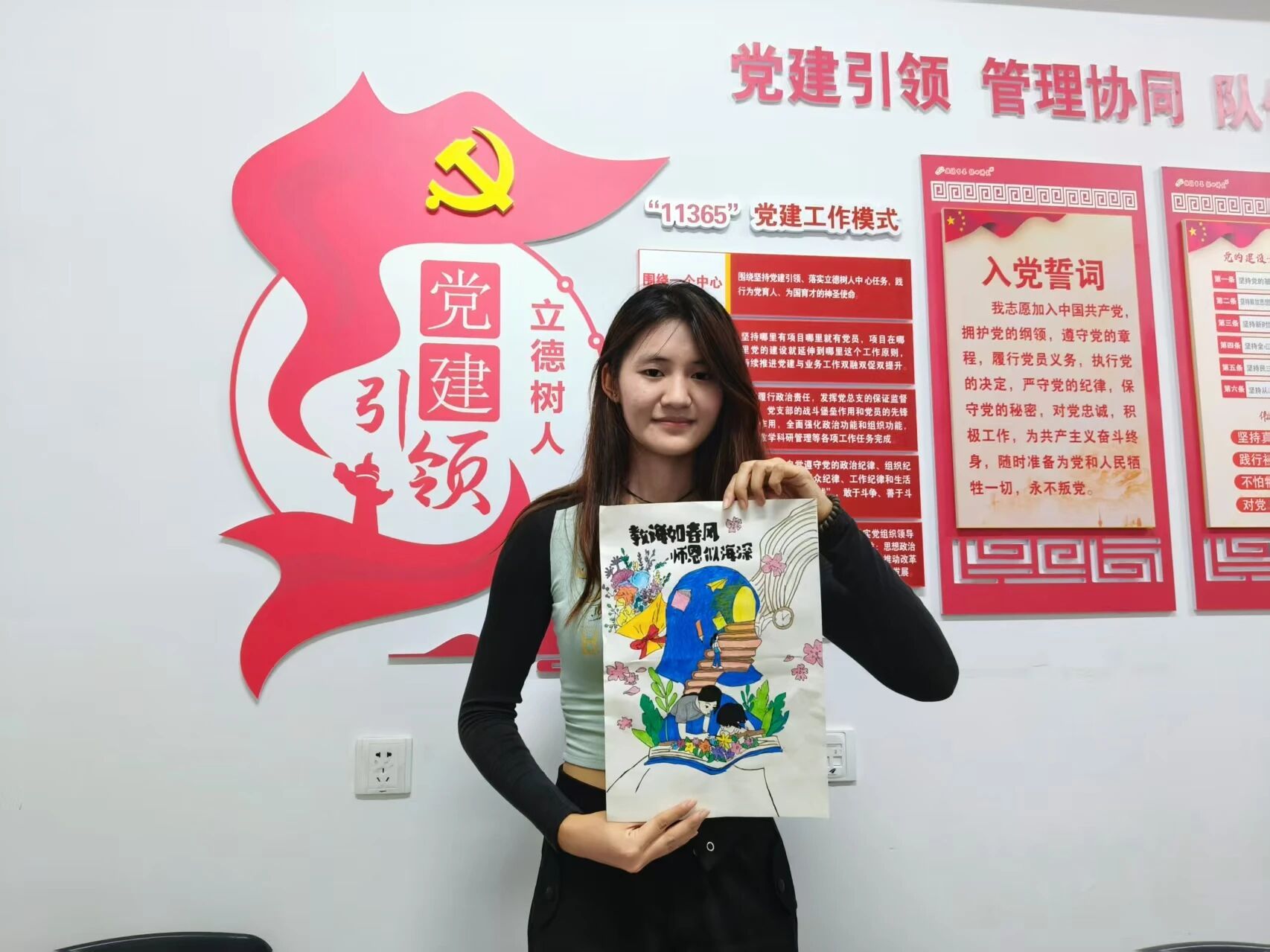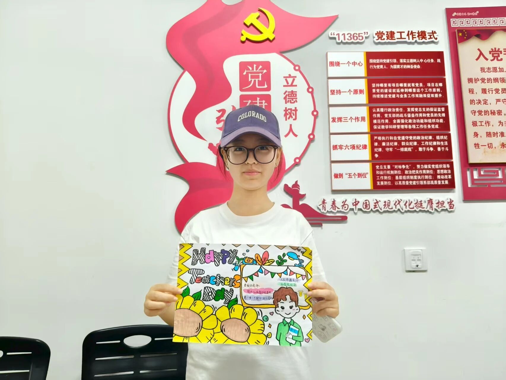画作用线条色调勾勒氛围,将师生相关元素重组,皆藏着对老师、辅导员的细致观察,把“为教师亮灯”的心意融进画里。