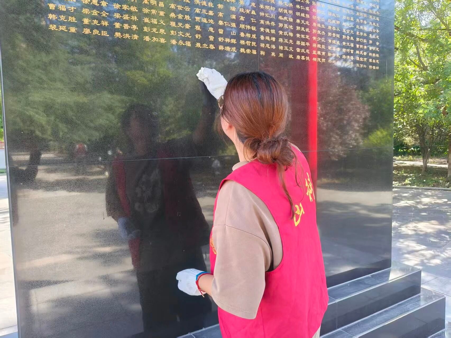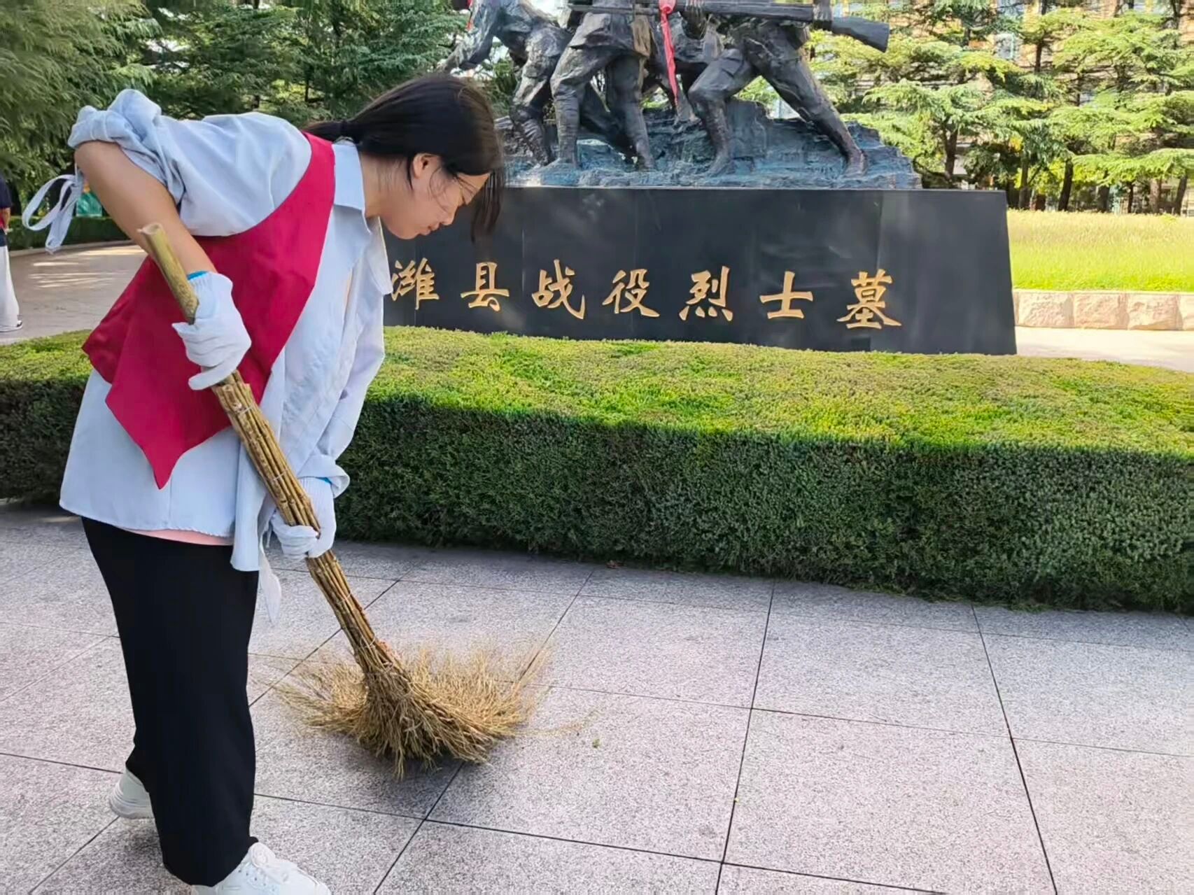 参观结束后,志愿者们怀着敬仰之情,迅速投入到烈士陵园的环境维护工作中。一组志愿者手持清洁工具,细致地擦拭烈士墓碑,清扫陵园内的枯枝落叶。另一组沿着陵园步道、草坪清理落叶、碎石与生活垃圾,细致排查卫生死角。每一次擦拭,都饱含着对先烈无限的追思;每一处打扫,都彰显着对英雄至高的敬仰。志愿者们以无声的劳动与赤诚的汗水,守护这片圣洁的“精神家园”,让红色遗迹焕发更加庄重光辉。