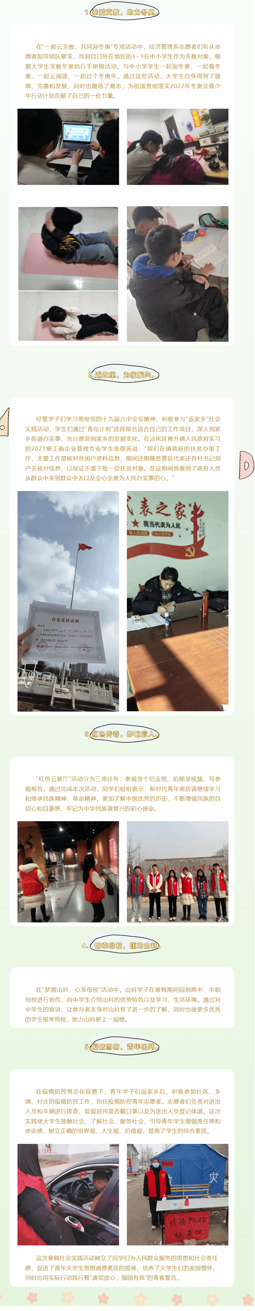 为深入学习贯彻习近平新时代中国特色社会主义思想和党的十九届六中全会精神,坚持“受教育、长才干、作贡献”的宗旨,引导广大青年学子走出校门、深入基层,增强社会责任感和使命感,提高运用知识解决实际问题的能力,丰富同学们的寒假生活。结合疫情防控各项工作要求和学院工作实际,经济管理系团总支组织开展2022年大学生寒假社会实践活动。