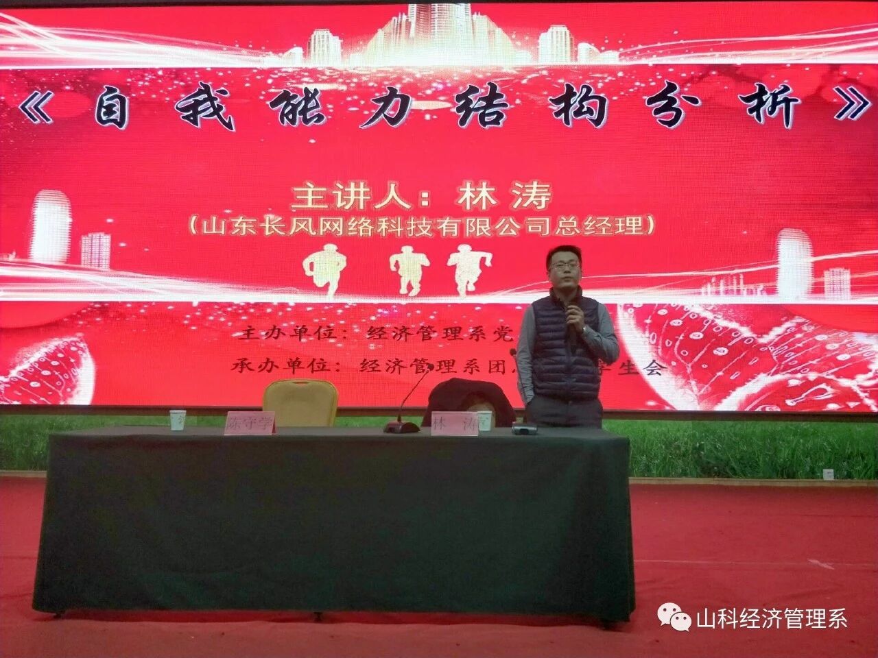 本次讲座中,经济管理系学生科科长李涛老师发言,希望在坐的同学们能够好好学习,脚踏实地去实现自己的理想。此次讲座,让同学们收获颇丰,深刻领略到了一位成功的企业家的个人魅力,牢记林涛总经理的谆谆教导。同时让同学们意识到人生中一定要有理想,明确自己的奋斗方向,把握住时机,成功就在眼前。