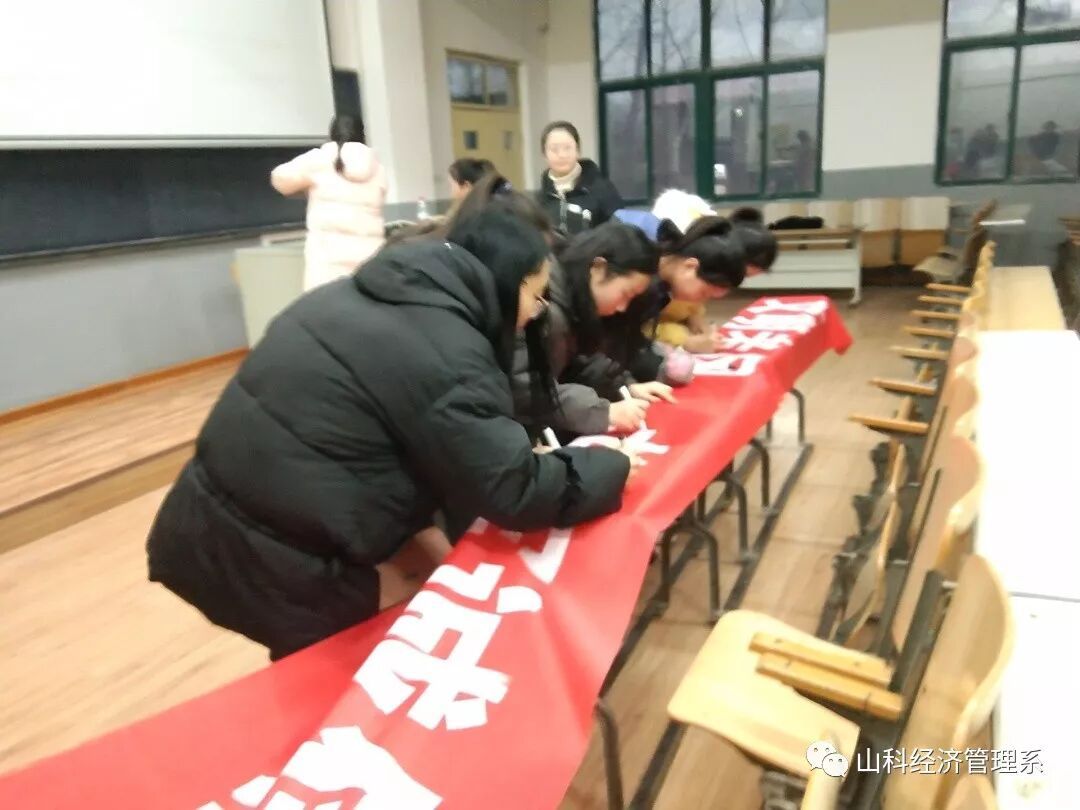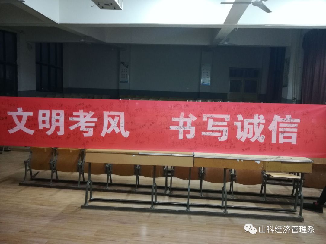 为了进一步加强学风建设、考风建设、营造公平、公正、诚实守信的考试,强化学生的诚信意识,促进学生树立诚信考试的风气。2019年1月3日,经济管理系三热诚信部在问辩楼214教室举办以“诚信你我,共筑文明经管”为主题的诚信考试横幅签名活动。