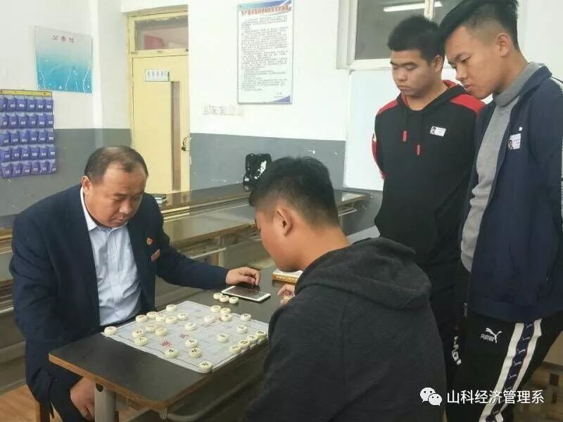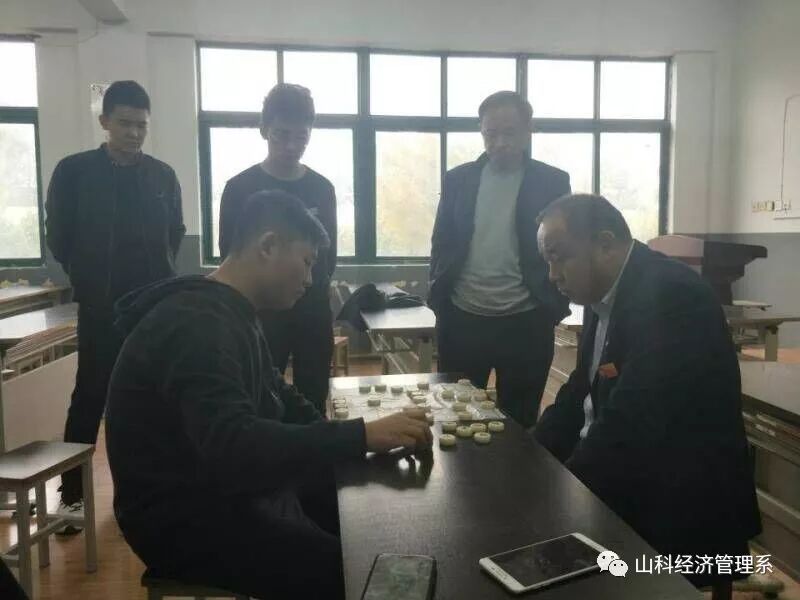 为增强学校的文化氛围个弘扬中华文化传统,我校特此举办了师生象棋比赛。2018年10月25日经济管理系在问辩楼206教室特举办师生象棋友谊赛,这次比赛不仅增强了师生间的感情,拉近了师生间的距离,放开了彼此的束缚。作为平等对手应战,陈书记与18级同学进行比赛,陈书记的战术强劲,同学们也不失灵活,双方盘踞在棋盘上不相上下,局面陷入紧张氛围。同学们屏住呼吸,生怕影响旗手的发挥。作为陈书记也不失半分懈怠,目不转睛,反应迅速。同学们更是认真卖力,不好出一点差错。经过两局这样的激烈“战争”,最终以平局作为比赛的结局,双方起身握手。如此酣畅淋漓的一次挑战,让双方大方痛快至此。陈书记能在百忙之中积极与同学们互动,沟通交流感情,同学们很是感动。