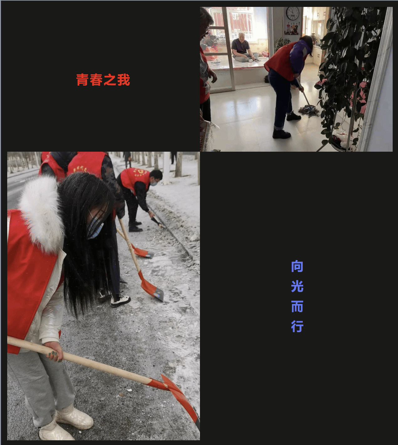 在活动中,志愿者们积极踊跃。我们首先是打扫庭院的垃圾与积雪,让庭院更加的宽敞整洁。清理完之后,我坐在床边陪着老人们聊天,询问他们的身体状况与生活情况,叮嘱老人们注意防护,保护好自己的身体,我紧紧握住他们的手,让老人们感受到亲人般的温暖。随后我们便为行动不便的老人搬弄炭火,让他们更好的度过严冬。志愿者每一个人都抱着勤勤恳恳的态度,干劲十足,用实际行动温暖着每一个人。