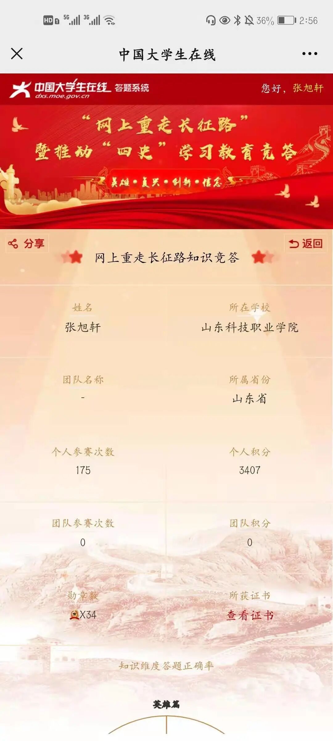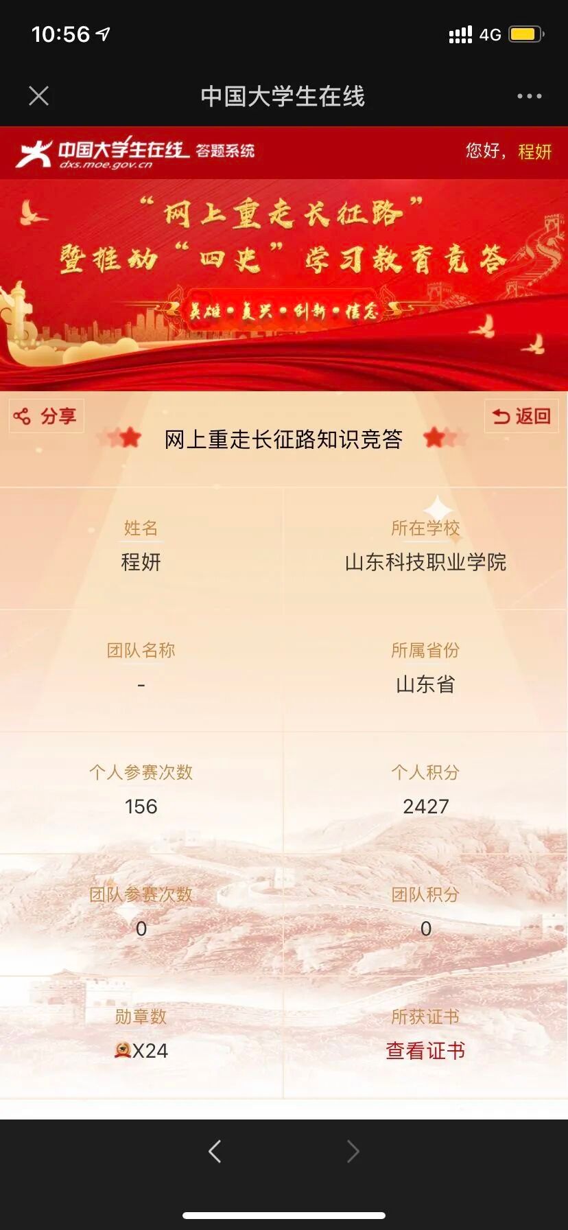 本次线上答题中,我系在校全体师生共1400余人参加,利用晚自习或无课时间进行线上答题,其中1300余人已拿到由中国大学生在线颁发的电子证书。此次答题让师生们加深了对“四史”的学习,重温了历史内容,深入了解了“四史”教育的历史意义与精神内涵,看到了历代国家领导人决策的重要性、国家发展方向的正确性以及中国人民的无限创造性。同学们纷纷表示,要修好“四史”这门必修课,从历史中汲取精神力量、汲取经验智慧,将小我融入大我,把青春献给祖国。
