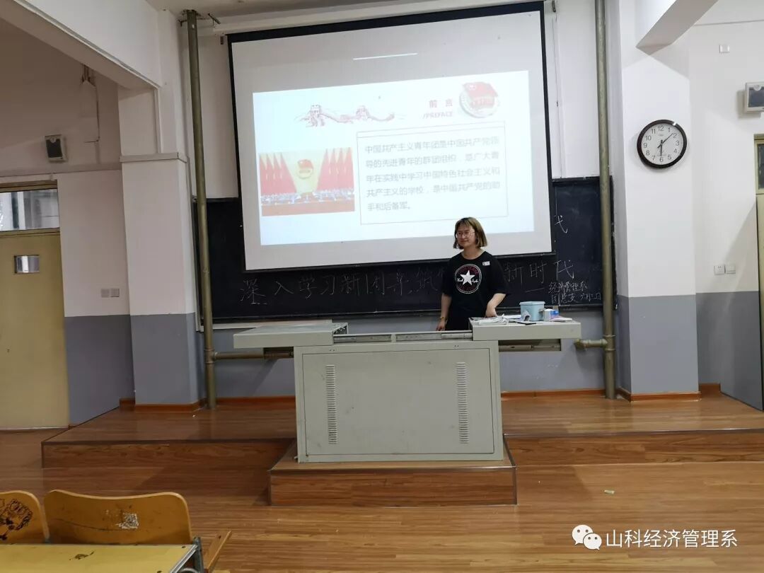 为贯彻落实习近平新时代中国特色社会主义思想,明确中国共产主义青年团在新时代的基本任务,坚持造就有理想、有道德、有文化、有纪律的四有青年,增强青年的社会责任感,努力使青年成为担当民族复兴大任的时代新人,我系团总支特于2019年6月3日晚六点在问辩楼214、209等教室召开以“深入学习新团章,筑梦建功新时代”为主题的第九期团课。