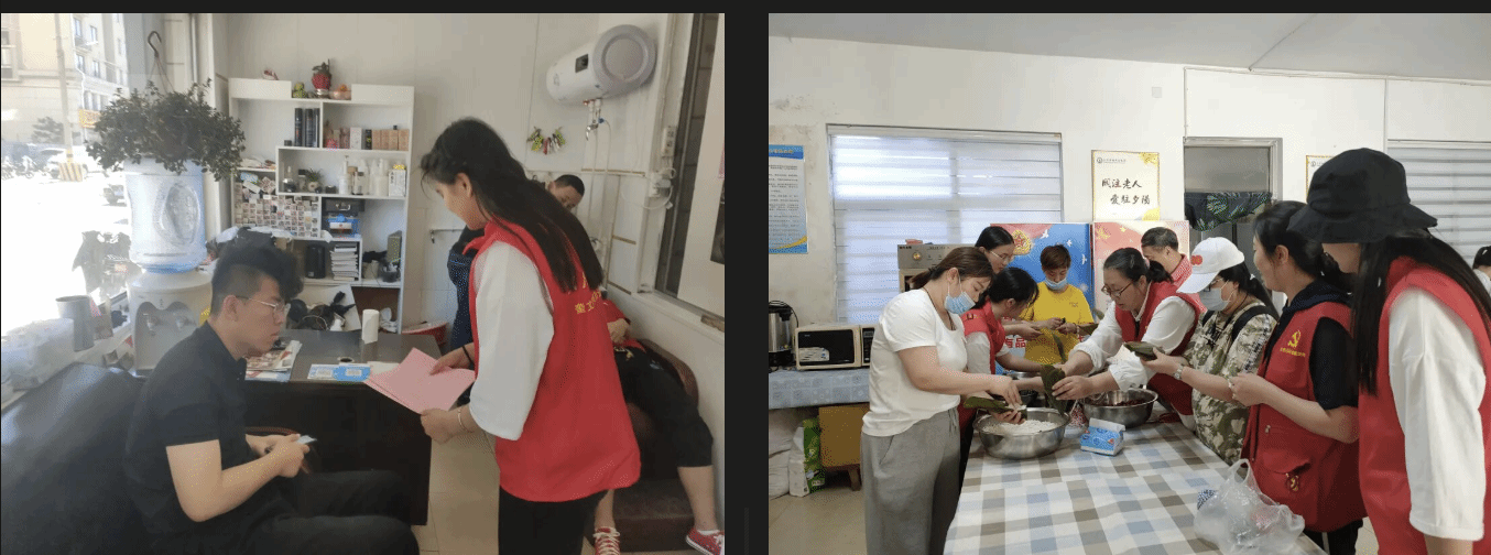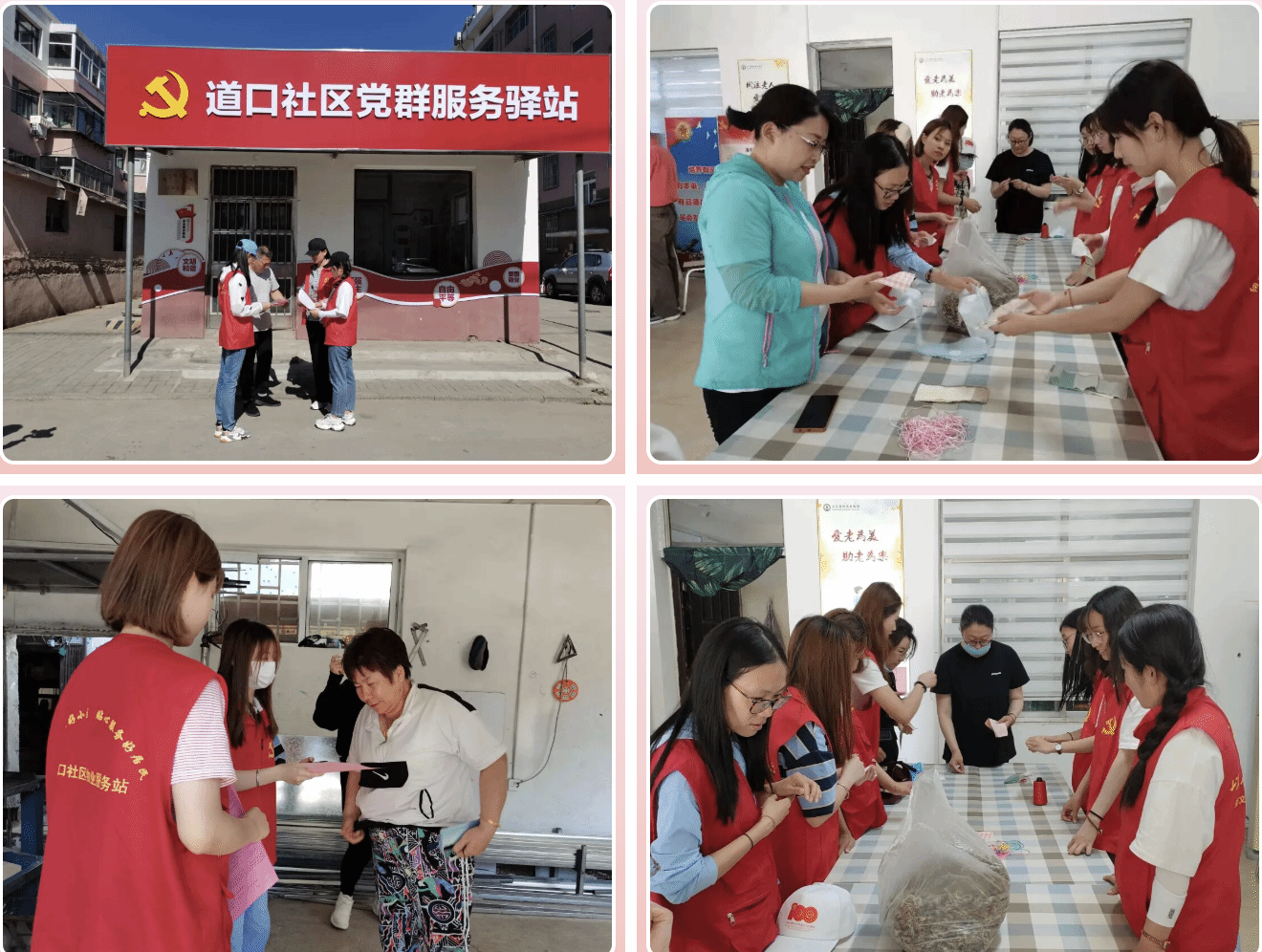 志愿者们到达道口社区后与社区工作人员沟通本次活动的主要流程及内容。首先志愿者三人一组,为社区居民们发放禁毒法律法规、燃气安全、用电安全等宣传单页,为社区公民们讲解安全知识,切实提高社区居民的安全意识。宣传活动结束后,志愿者们前往社区大食堂,各位志愿者分工明确,共同协作,帮助社区服务人员包粽子、绣香包,最后将粽子送到敬老院老人的手中,让老人们提前感受到端午节的氛围,也感受到社会的关爱。