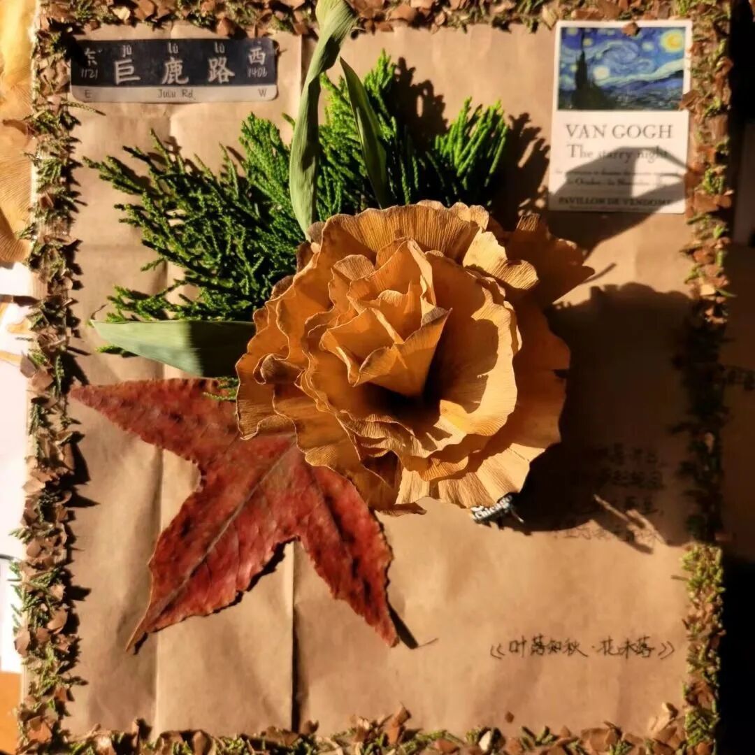 活动开展期间,同学们就地取材,纷纷收集校园中的落叶,并将它们经过清洗,消毒,剪裁,压平,晾晒等步骤后进行作品创作。每一份作品上面都有着同学们对此次活动主题的解析。最后大家展现的作品类型主要有叶贴画,手工玫瑰花等,这些作品充分地展示着同学们的创意才能。
