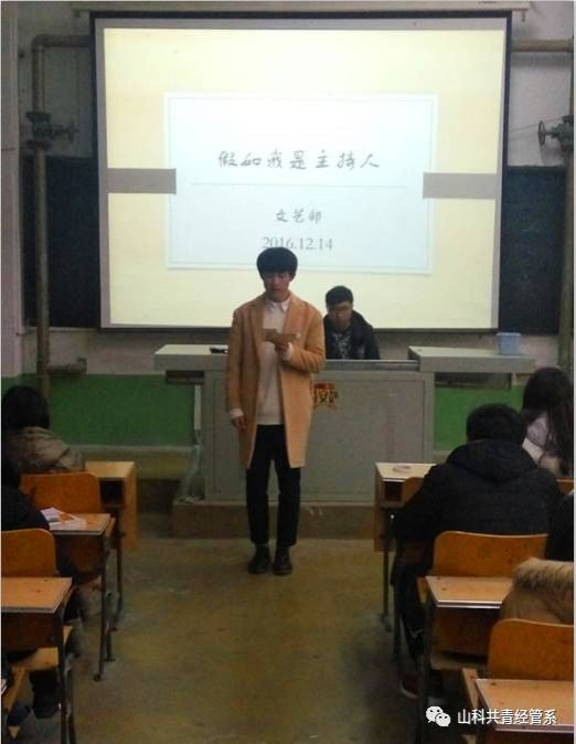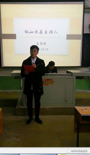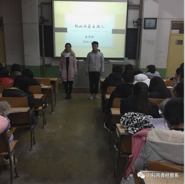 为了丰富校园文化生活,拓展大学生的综合素质,向爱好主持的同学提供一个展示自我的舞台,也是为了元旦晚会活动储备主持人才,经济管理系文艺部于12月14日晚在问辩楼414教室组织“假如你是主持人”比赛。