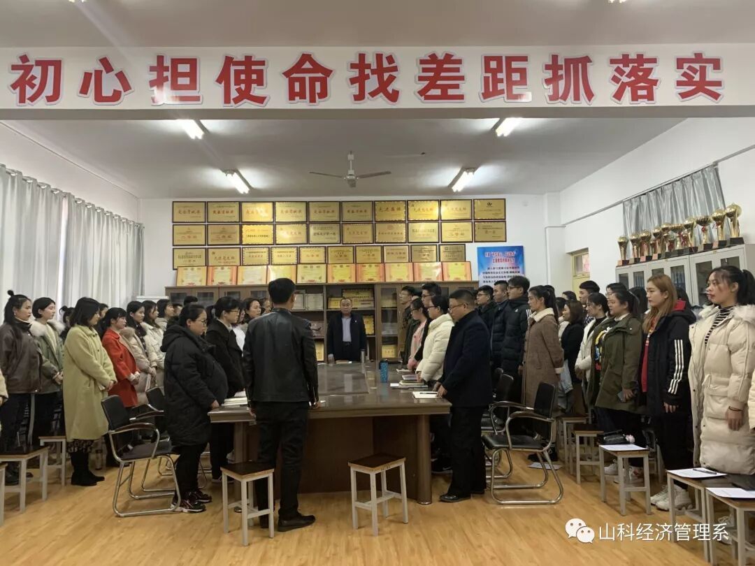 在经济管理系党总支书记陈守学的领誓下,41名新发展的教师和学生预备党员面向党旗进行了入党宣誓,短短一百多字的誓词是他们入党后对党的第一个承诺。宣誓前,全体起立,奏《国际歌》,学生党支部组织委员刘尚林宣读了学院党委对接收陈璐等41名同志为中共预备党员的审批意见。