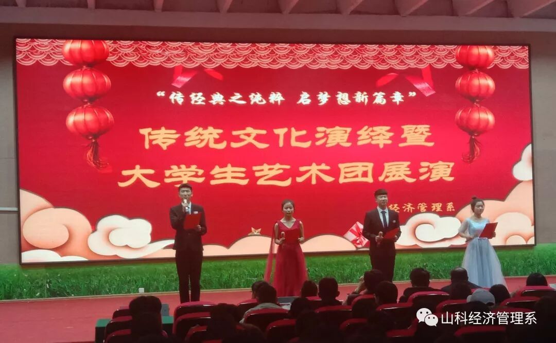 晚会在大学生艺术团宣传片的播放中拉开帷幕,激情澎湃的开场舞由艺术团舞蹈部成员及19级班长代表为大家共同演绎。活力四射的歌曲串烧《律动人生》让在场观众掌声雷动。手势舞《隐形的翅膀》、舞蹈《知否,知否》、歌伴舞《赤伶》表演精彩纷呈。小品《致敬英雄》的精彩演绎,让每一位在场观众都深入其中。歌曲《活着》、朗诵《秋瑾》、吉他弹唱《世间美好与你环环相扣》节目编排独具匠心,表演精彩纷呈。藏舞《康定情歌》、情景表演《少年英雄》编排新颖,生动活泼,青春气息扑面而来!话剧《芦衣顺母》同学们精彩的表演为大家讲述了《二十四孝》的故事,赢得了观众们的阵阵掌声。随后经济管理系党总支书记陈守学老师,为大家做了总结发言,鼓励了台前幕后的所有演员,同时也告诉同学们要在新时代把握好时代方向,好好学习。