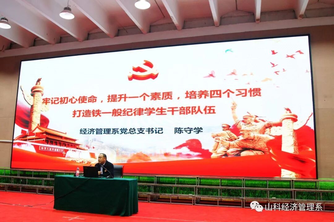 大会最后由党总支书记陈守学做“牢记初心使命,提升一个素质,培养四个习惯,打造铁一般纪律学生干部队伍”专题讲座。他首先要求学生会全体成员要坚持跟党走,不忘初心,牢记使命,提高政治素质,做新时代优秀的学生干部。讲座从共产党人的“初心”是什么、为什么要“不忘初心”、如何才能“不忘初心”以及学生会干部素质和能力建设四个方面进行了具体阐述。