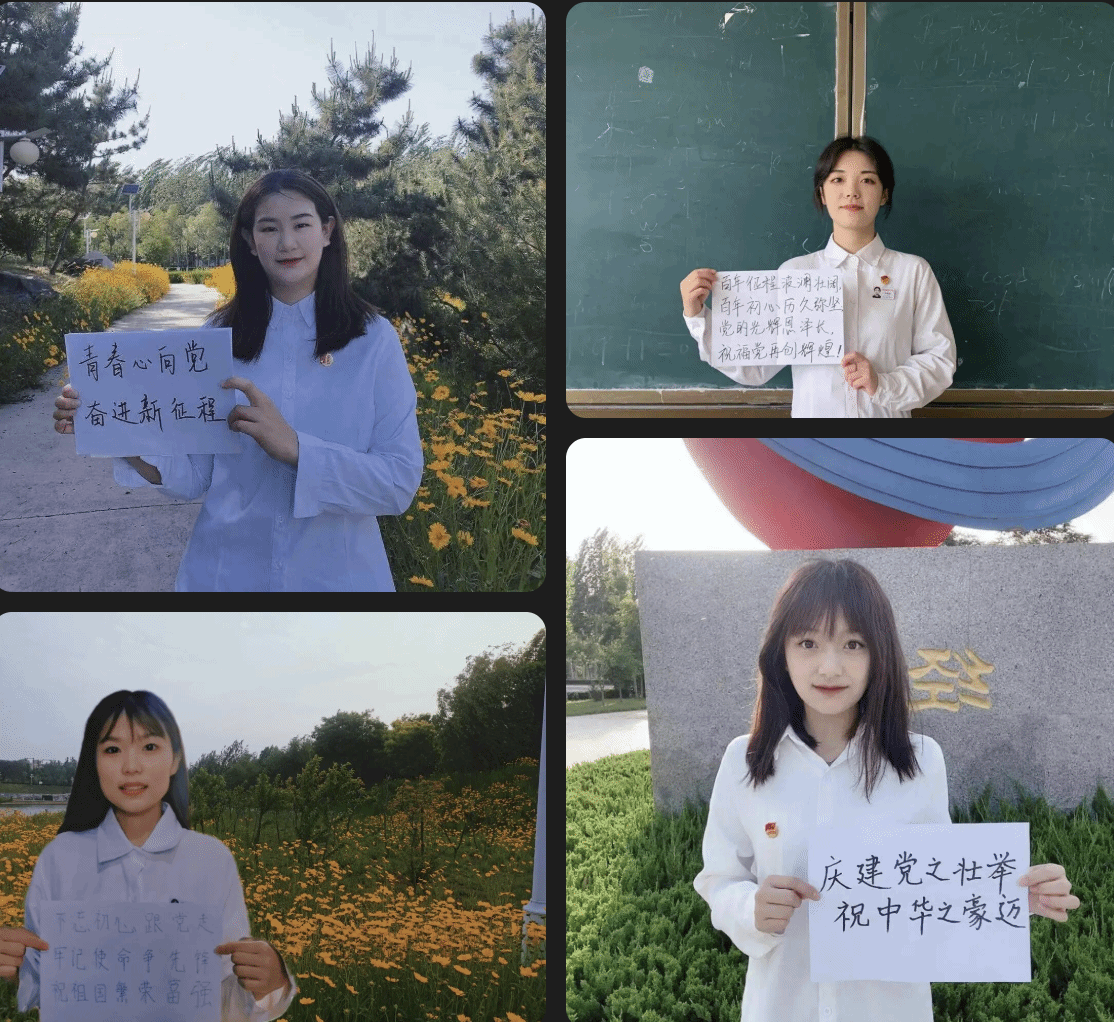 本次活动是通过收集同学们手握一百周年祝词照片的形式展开。图片中同学们身着白色衬衣佩戴团徽,嘴角微微上扬,手握本次活动的祝词,用饱满热情的神态,叙述着对建党一百年来呕心沥血的敬畏,展现新时代青年人积极向上的精神风貌和拳拳爱国之心,表达对党,对祖国,对美好生活的热爱之情。通过这种形式来激励当代大学生应肩负起新时代的职责与使命。