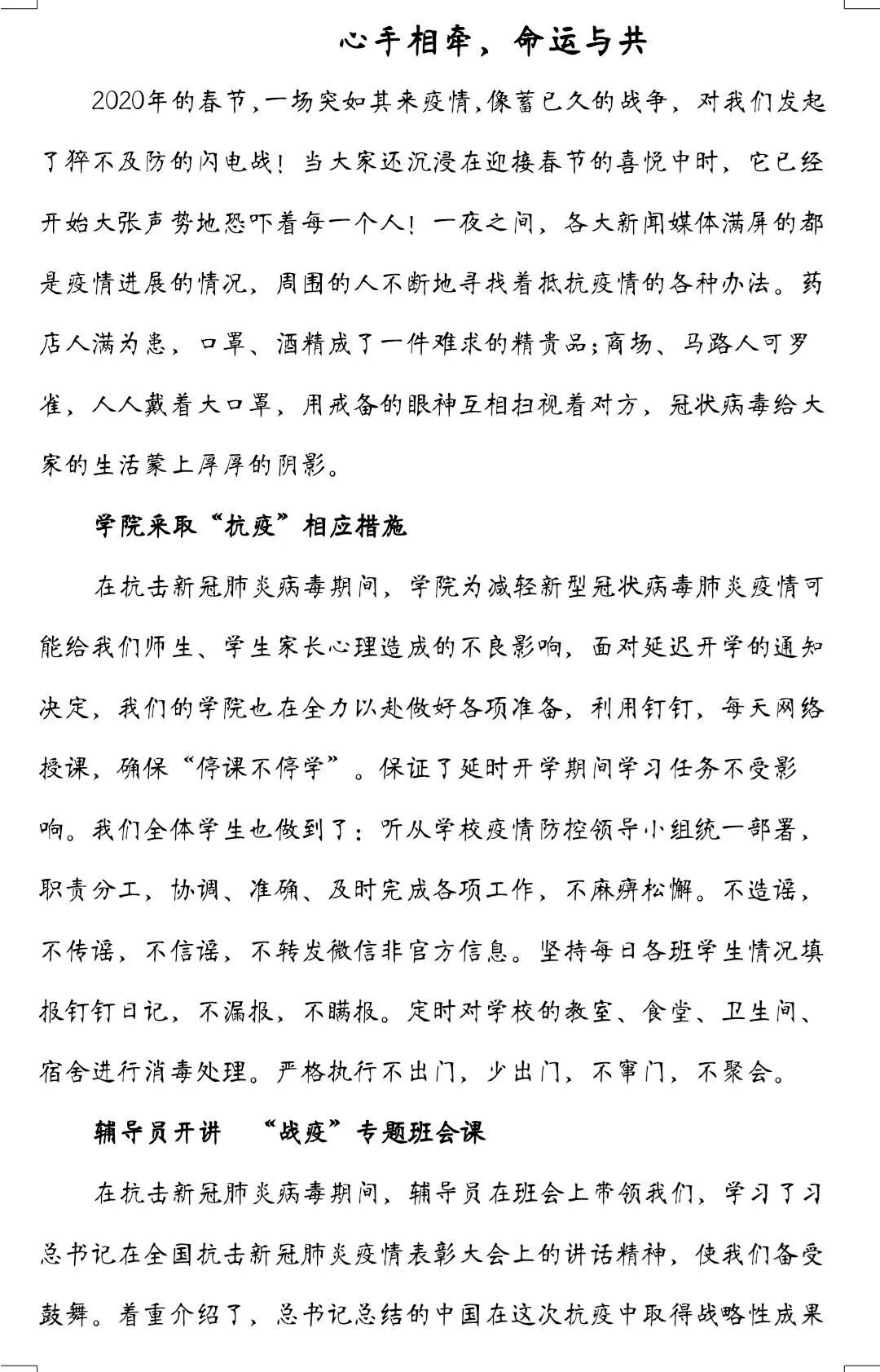 在抗击新冠肺炎的战役中,我系涌现了很多平凡的英雄,传颂着很多感人的故事。为贯彻落实习近平总书记关于要讲好中国疫情故事的指示精神,引导青年学生向英雄模范学习,增进爱国主义情怀,经研究我系团总支文明实践部特举办“心手相牵,命运与共”抗疫小故事征文活动。