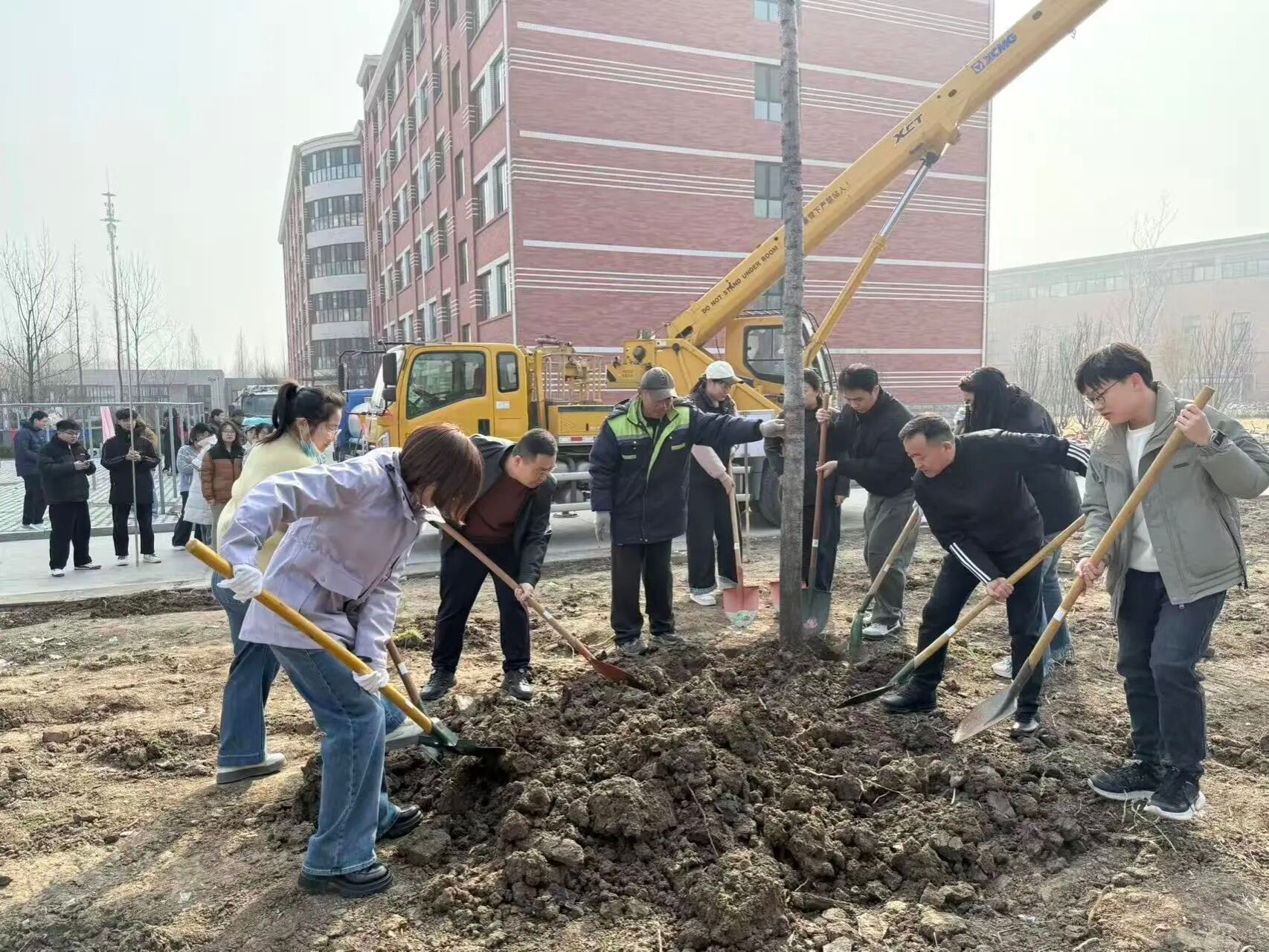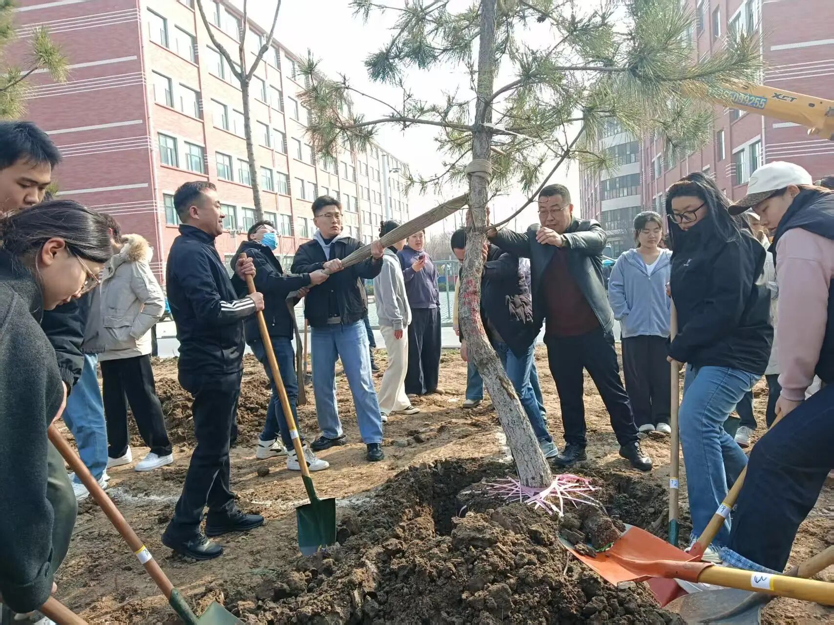 植树现场,一派热火朝天的劳动景象。大家热情高涨,分工协作,挥锹铲土、扶苗填坑、踩实浇水,每一道工序都认真细致、有条不紊。春风拂过,一棵棵新栽的树苗傲然挺立,为初春的校园播撒希望,焕发出勃勃生机。随后,师生们共同为树苗悬挂养护提示牌,并合影留念。